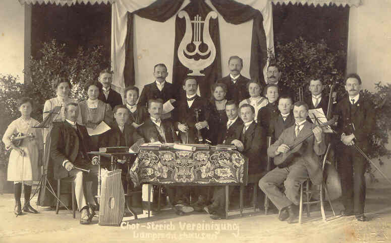 Zum ersten Chorleiter oder „Chormeister" bestellte man den Lamprechtshausener Lehrer Hans Klier.(Später bekannt durch seine zahlreichen kompositorischen Werke als Organist der Pfarrkirche Oberndorf- „Stille-Nacht-Messe", etc.), Am 5.4.1907 wurde die erste urkundlich belegte Gesangsprobe, an der 8 Sänger teilnahmen, abgehalten. Der Männergesangverein hatte in der Zeit vor dem ersten Weltkrieg 12 aktive Mitglieder. |